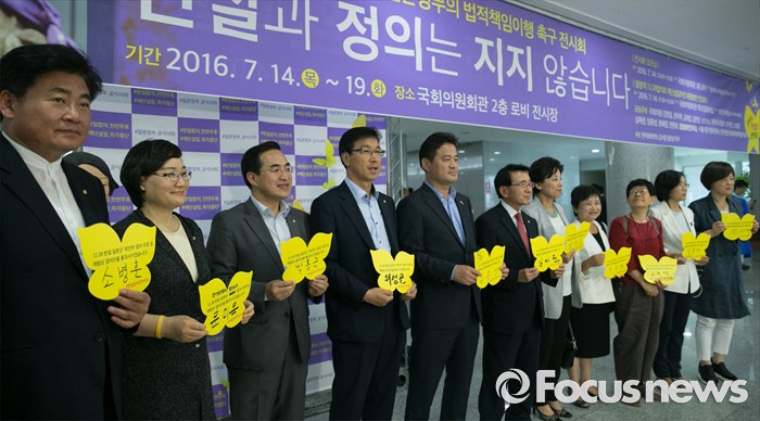 (서울=포커스뉴스) 더불어민주당 소속 심재권 외교통일위원장과 남인순 여성가족위원장 등 의원들이 14일 오후 서울 여의도 국회 의원회관에서 열린 12·28 한일합의 무효화와 일본정부의 법적책임이행 촉구를 위한 '진실과 정의는 지지 않습니다' 전시회에 참석해 본인들이 서명한 노란 나비 종이를 들고 포즈를 취하고 있다.