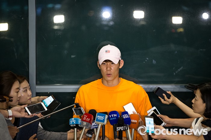 (인천공항=포커스뉴스) 리우 올림픽 출전이 확정된 '마린보이' 박태환이 호주 전지훈련을 마치고 14일 오후 인천국제공항을 통해 입국해 기자회견을 하고 있다.