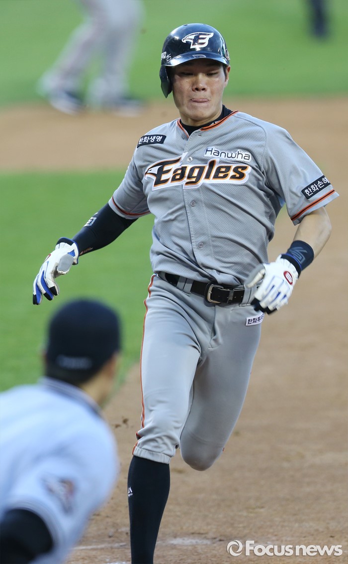 (서울=포커스뉴스) 14일 서울 잠실구장에서 열린 2016 프로야구 한화-LG 경기 2회초 2사 1,2루에서 한화 이용규의 우전 안타때 2루주자 강경학이 홈인하고 있다.