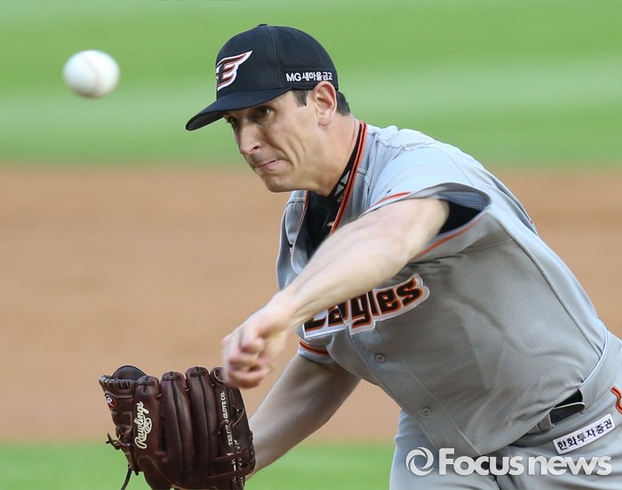 (서울=포커스뉴스) 14일 서울 잠실구장에서 열린 2016 프로야구 한화-LG 경기에서 1회말 한화 선발투수 서캠프가 투구하고 있다.