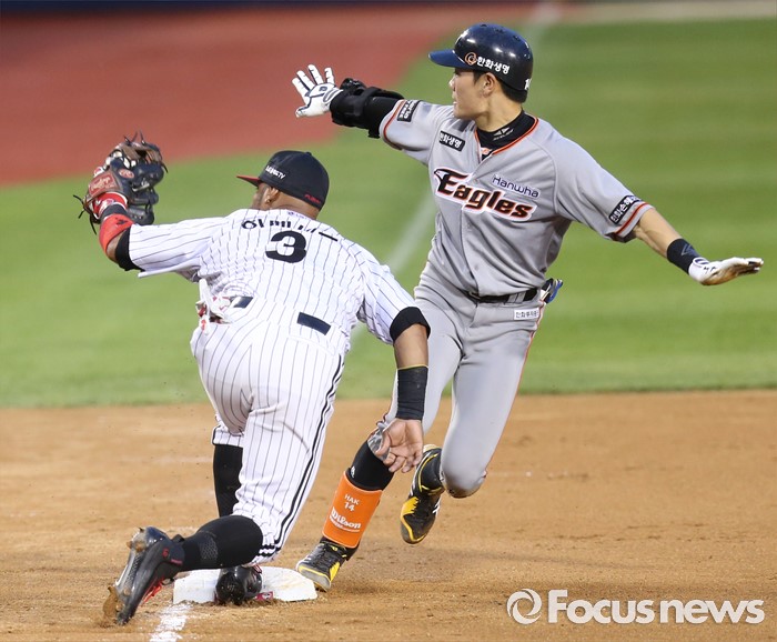 (서울=포커스뉴스) 14일 서울 잠실구장에서 열린 2016 프로야구 한화-LG 경기 4회초 한화 강경학이 우익선상으로 빠지는 타구를 날리고 3루에서 슬라이딩하며 베이스를 밟고 3루심을 바라보고 있다.