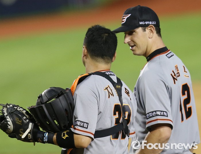 (서울=포커스뉴스) 14일 서울 잠실구장에서 열린 2016 프로야구 한화-LG 경기에서 한화 포수 차일목과 투수 서캠프가 4회말 수비를 마치고 함께 덕아웃으로 향하고 있다.