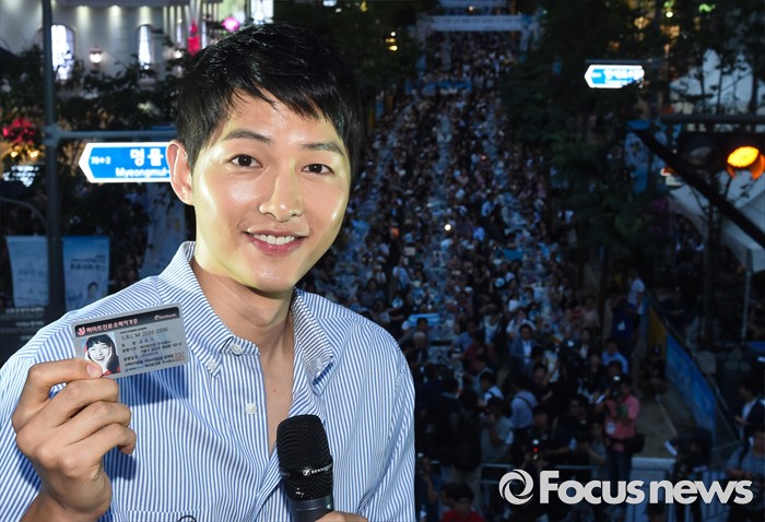 (서울=포커스뉴스) 14일 오후 서울 서대문구 신촌 일대에서 열린'제2회 신촌맥주축제'에 참석한 배우 송중기가 소맥자격증을 들고 포즈를 취하고 있다.