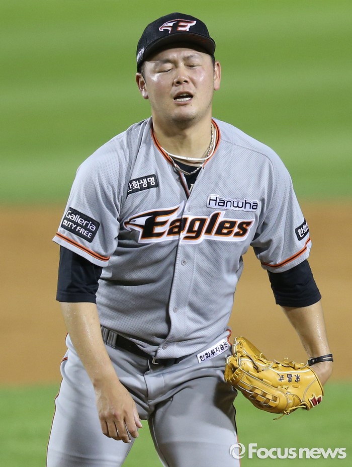 (서울=포커스뉴스) 14일 서울 잠실구장에서 열린 2016 프로야구 한화-LG 경기 7회말 2사후 한화 투수 송창식이 LG 박용택을 몸에 맞는 볼로 진루시키며 아쉬워하고 있다.