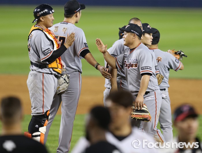 (서울=포커스뉴스) 14일 서울 잠실구장에서 열린 2016 프로야구 한화-LG 경기에서 LG에 승리하며 순위 바꿈을 해 7위로 올라선 한화 선수들이 하이파이브하고 있다.
