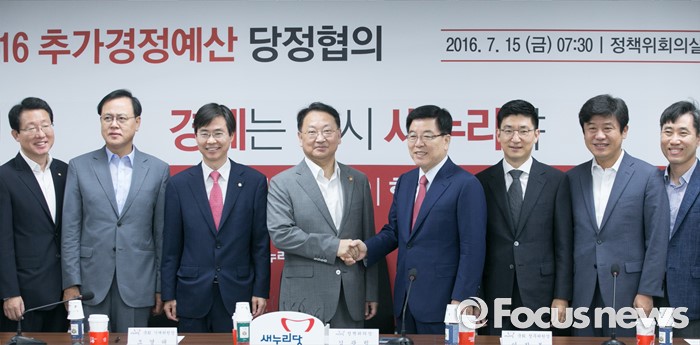 (서울=포커스뉴스) 15일 오전 서울 여의도 국회에서 열린 2016년도 추가경정예산 당정협의에 참석한 의원들과 유일호 경제부총리 겸 기획재정부 장관과 김광림 새누리당 정책위의장 등 의원들이 기념촬영을 하고 있다. 왼쪽부터 김상훈 정책위수석부의장, 이명수 민생특위 위원장, 조경태 국회 기획재정위원장, 유 부총리, 김 정책위의장, 김세연 미래특위 위원장, 유의동 정무위 간사, 하태경 환노위 간사.
