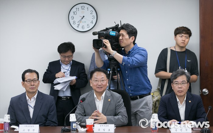 (서울=포커스뉴스) 15일 오전 서울 여의도 국회에서 열린 2016년도 추가경정예산 당정협의에 참석한 유일호(가운데) 경제부총리 겸 기획재정부 장관이 인사말을 하고 있다.