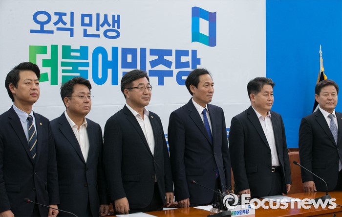 (서울=포커스뉴스) 15일 오전 서울 여의도 국회에서 열린 더불어민주당 사드대책위원회의에 참석한 우상호 원내대표와 의원들이 취재진을 향해 포즈를 취하고 있다. 왼쪽부터 김영호, 이철희, 윤호중 의원, 우 원내대표, 김경협, 정재호 의원.