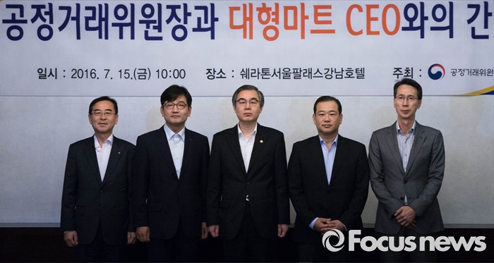 (서울=포커스뉴스) 15일 오전 서울 서초구 쉐라톤팔래스호텔에서 열린 '대형마트CEO 간담회'에 참석한 정재찬(중앙) 공정거래위원장이 간담회에 앞서 기념촬영을 하고 있다.