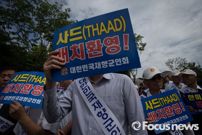 (서울=포커스뉴스) 15일 오전 서울 용산 국방부 앞에서 재향군인회 회원들 및 관계자들이 사드 배치 환영 기자회견을 하고 있다.
