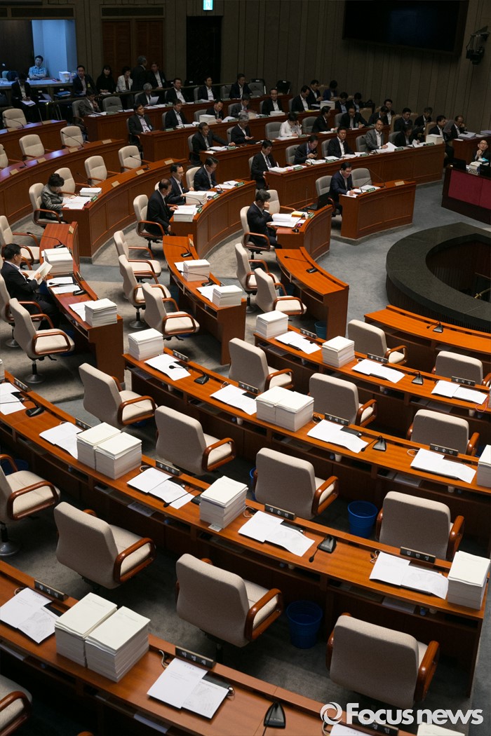 (서울=포커스뉴스) 15일 오전 서울 여의도 국회에서 예정된 예산결산특별위원회 전체회의에 새누리당 의원들이 불참해 빈 자리가 보이고 있다. 이날 새누리당은 더불어민주당 소속 홍영표 국회 환경노동위원장이 야당 단독으로 예비비 지출안 등을 처리한 것과 관련해 홍 위원장의 사퇴를 요구하며 모든 상임위 보이콧을 선언했다.