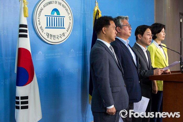 (서울=포커스뉴스) 국회 법제사법위원회 더불어민주당 간사 박범계(오른쪽 두 번째) 의원을 비롯한 야당 법사위 소속 의원들이 15일 오전 서울 여의도 국회에서 진경준 검사장 사건과 관련해 법무부 장관 및 검찰총장 사죄 촉구 기자회견을 하고 있다.