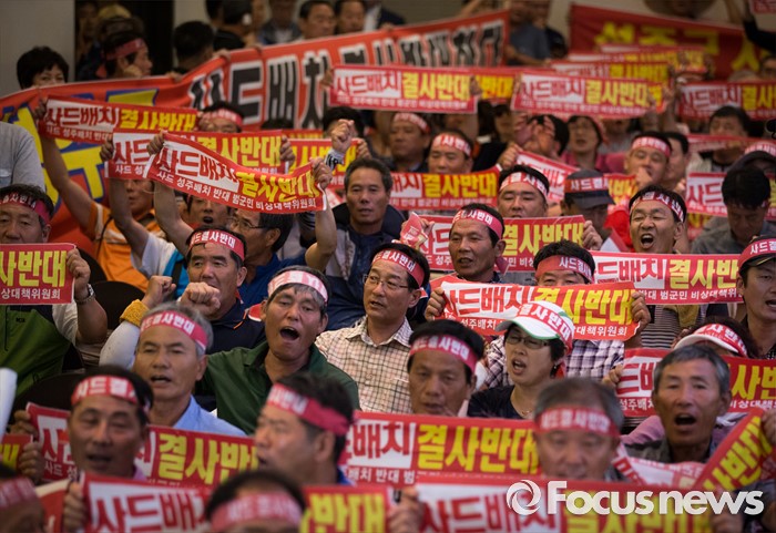 또 황 총리는 주민들의 항의가 계속되자 성주군 청사 안으로 대피했다.13일 오후 서울 용산구 국방컨벤션센터에서 사드 배치에 항의 방문 중인 김항곤 성주군수 등 사회단체장 및 군민들이 성주 사드 배치 반대 구호를 외치고 있다. 국방부는 이날 경북 성주군을 고고도 미사일 방어(사드·THAAD)체계 배치 지역이라고 공식 발표했다. 2016.07.14 김흥구 기자