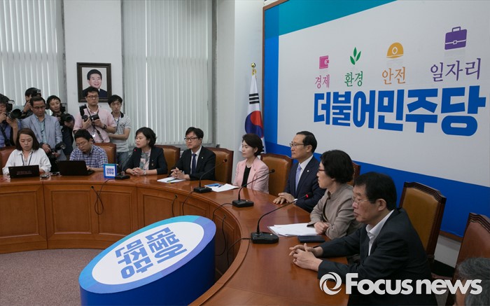 (서울=포커스뉴스) 15일 오전 서울 여의도 국회에서 홍영표 국회 환경노동위원장과 야당 환노위원들이 결산 표결 관련 입장을 전하는 기자간담회를 하고 있다. 이날 새누리당은 더불어민주당 소속 홍 위원장이 야당 단독으로 예비비 지출안 등을 처리한 것과 관련해 위원장 사퇴를 요구하며 모든 상임위 보이콧을 선언했다.