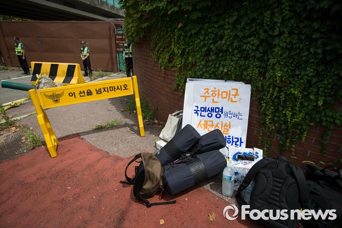 (서울=포커스뉴스) 좋은 대한민국 만들기 대학생 운동본부' 소속 학생들이 15일 오전 서울 용산 미군 기지 앞에서 '사드 배치 반대 48시간 대학생 긴급농성 선포' 기자회견을 열고 있다. 이날 대학생들은 기자회견을 마친 후 용산 미군 기지 2번 게이트 앞에서 48시간 농성에 들어갔다. 미군 기지 앞에 대학생들이 농성에 쓸 용품들이 놓여져 있다.