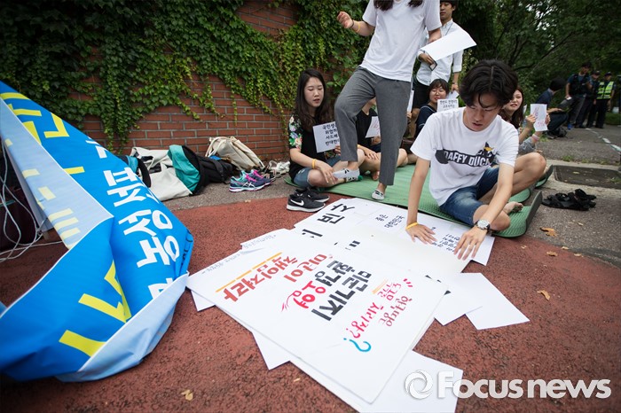 (서울=포커스뉴스) 좋은 대한민국 만들기 대학생 운동본부' 소속 학생들이 15일 오전 서울 용산 미군 기지 앞에서 '사드 배치 반대 48시간 대학생 긴급농성 선포' 기자회견을 마친 후 농성에 들어가고 있다.