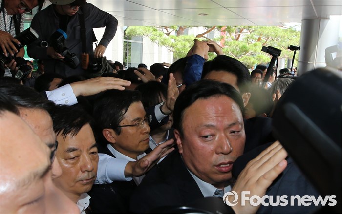 (성주=포커스뉴스) 황교안 국무총리와 한민구 국방부장관이 15일 오전 경북 성주군청광장에서 사드(THAAD, 고고도미사일방어체계) 배치에 대한 주민설명회를 가진 가운데 성난 주민이 물병을 투척하자 경호원들이 막고 있다.