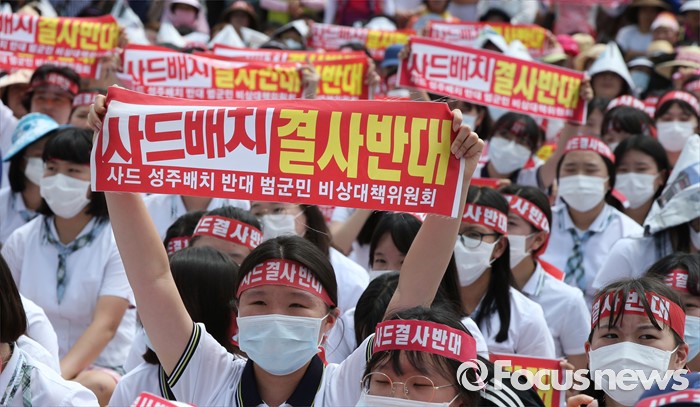 (성주=포커스뉴스) 황교안 국무총리와 한민구 국방부장관이 15일 오전 경북 성주군청광장에서 사드(THAAD, 고고도미사일방어체계) 배치에 대한 주민설명회를 가진 가운데 성주 주민들이 사드배치 반드를 주장하고 있다.