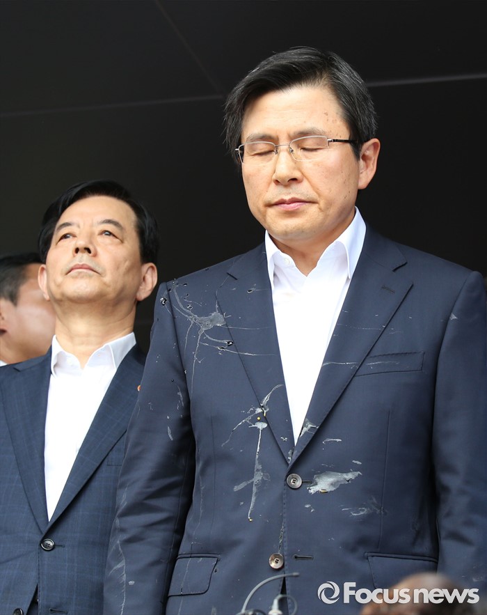 (성주=포커스뉴스) 황교안 국무총리가 15일 오전 경북 성주군청광장에서 사드(THAAD, 고고도미사일방어체계) 배치에 대한 주민설명회를 가진 가운데 성난 주민이 물병과 소금, 계란을 맞고 잠시 눈을 감고 있다.