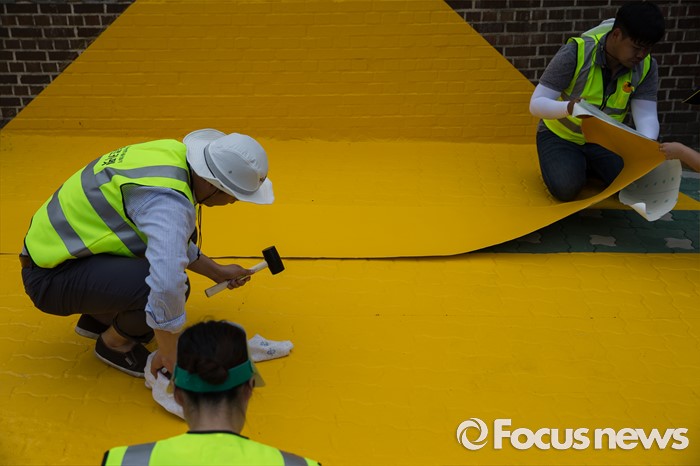 (서울=포커스뉴스) 15일 오전 서울 성북구 안암초등학교 앞에서 열린 아동안전 프로젝트 '옐로카펫' 제작행사에 참여한 학부모 및 행사 관계자들이 카펫을 설치하고 있다.