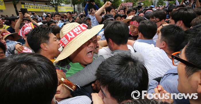 (성주=포커스뉴스) 황교안 국무총리와 한민구 국방부장관이 15일 오전 경북 성주군청광장에서 사드(THAAD, 고고도미사일방어체계) 배치에 대한 주민설명회를 마치고 차량에 오르자 주민들이 항의하고 있다.