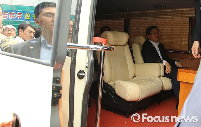 (성주=포커스뉴스) 황교안 국무총리가 15일 오전 경북 성주군청광장에서 사드(THAAD, 고고도미사일방어체계) 배치에 대한 주민설명회를 마치고 차량에 탑승해 있다.