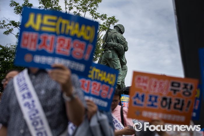 (서울=포커스뉴스) 15일 오전 서울 용산 국방부 앞에서 재향군인회 회원들 및 관계자들이 사드 배치 환영 기자회견을 하고 있다.