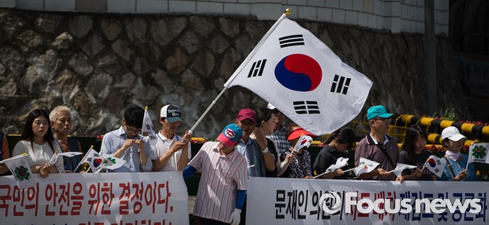 (서울=포커스뉴스) 15일 오전 서울 용산 국방부 앞에서 재향군인회 회원들 및 관계자들이 사드 배치 환영 기자회견을 하고 있다.