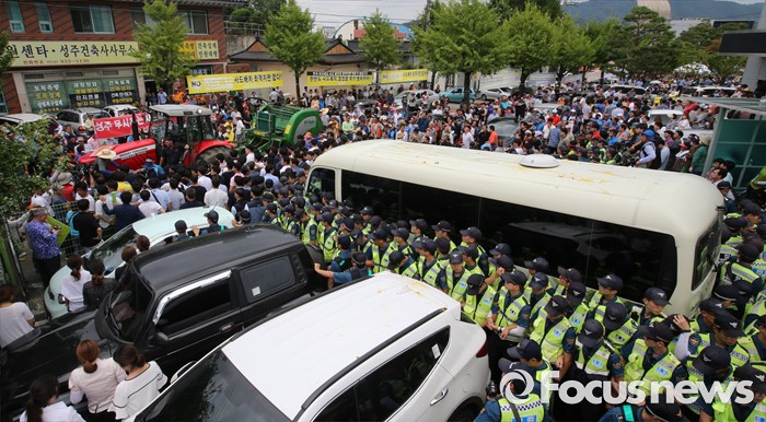 (성주=포커스뉴스) 황교안 국무총리와 한민구 국방부장관이 15일 오전 경북 성주군청광장에서 사드(THAAD, 고고도미사일방어체계) 배치에 대한 주민설명회를 마치고 차량에 오르자 주민들이 트렉터를 동원해 차량을 막고 항의하고 있다.