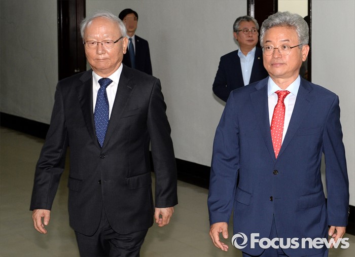 (서울=포커스뉴스) 15일 오후 서울 여의도 국회에서 열린 정보위원회 전체회의에 이병호(왼쪽) 국가정보원장과 이철우 국회 정보위원장이 참석하고 있다.