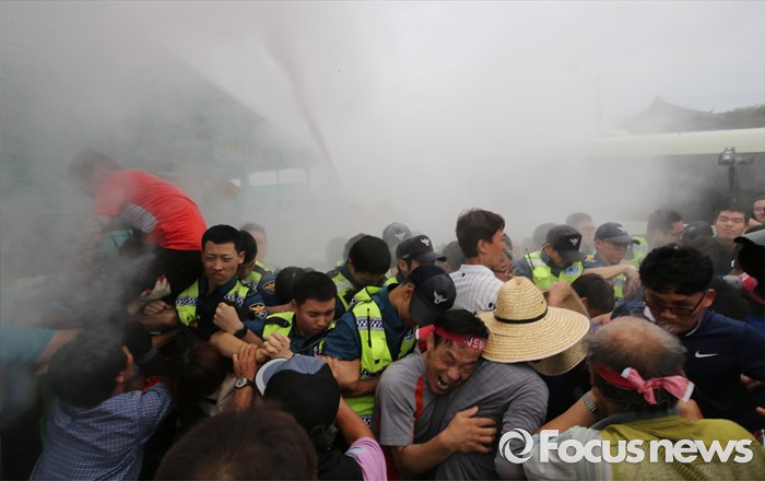 (성주=포커스뉴스) 황교안 국무총리와 한민구 국방부장관이 15일 경북 성주군청광장에서 사드(THAAD, 고고도미사일방어체계) 배치에 대한 주민설명회를 마치고 차량에 갖혀 6시간 넘게 대치중 버스에서 내려 승용차로 빠져나가려 하자 성주 주민들과 경찰이 몸싸움을 하고 있다.