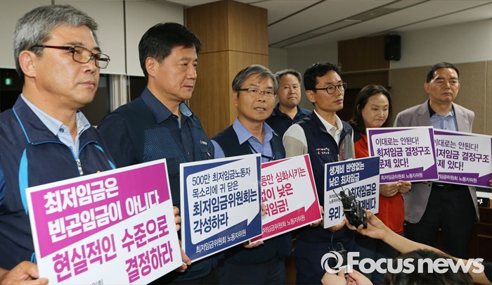 (세종=포커스뉴스) 15일 저녁 세종시 정부세종청사 고용노동부에서 열린 최저임금위원회 제13차 전원회의에서 근로자 위원들이 운영위원회와 논의하지 않은 일방적인 회의 진행으로 심의에 동참할 수 없다고 밝히고 있다.