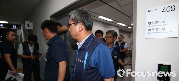 (세종=포커스뉴스) 15일 저녁 세종시 정부세종청사 고용노동부에서 열린 최저임금위원회 제13차 전원회의에서 근로자 위원들이 일방적인 회의 진행에 동참할 수 없다며 회의장을 나서고 있다.