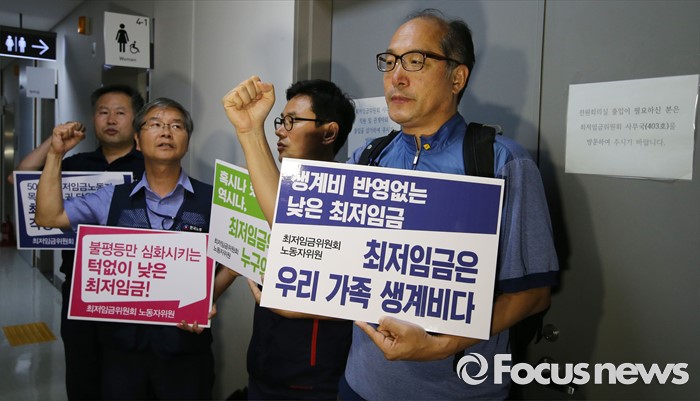 (세종=포커스뉴스) 15일 저녁 세종시 정부세종청사 고용노동부에서 열린 최저임금위원회 제13차 전원회의에서 근로자 위원들이 운영위원회와 논의하지 않은 일방적인 회의 진행으로 심의에 동참할 수 없다고 밝히고 구호를 외치고 있다.