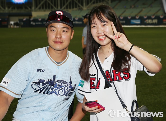 (서울=포커스뉴스) 16일 서울 고척 스카이돔에서 열린 2016 프로야구 올스타 경기에 앞서 가진 팬사인회에서 드림팀의 민병헌이 여성팬과 기념사진을 찍고 있다.