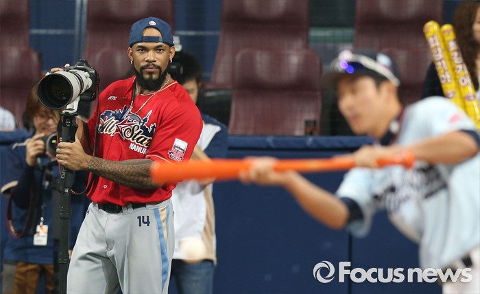 (서울=포커스뉴스) 16일 서울 고척 스카이돔에서 열린 2016 프로야구 올스타 경기에 앞서 가진 번트왕 대회에서 나눔팀의 테임즈가 카메라를 들고 허경민을 바라보고 있다.