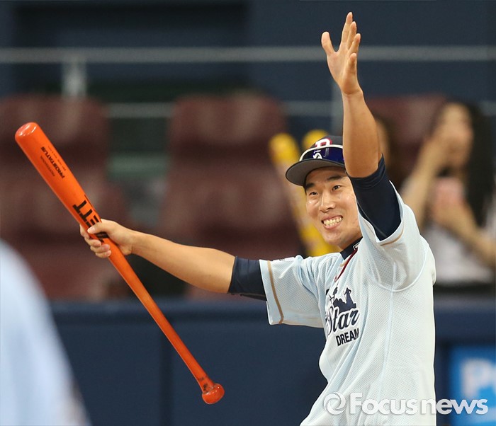 (서울=포커스뉴스) 16일 서울 고척 스카이돔에서 열린 2016 프로야구 올스타 경기에 앞서 가진 번트왕 대회에서 드림팀의 허경민이 타구가 표적의 만점구역에 들어가자 기뻐하고 있다.