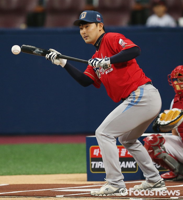 (서울=포커스뉴스) 16일 서울 고척 스카이돔에서 열린 2016 프로야구 올스타 경기에 앞서 가진 번트왕 대회에서 나눔팀의 임창민이 정확하게 번트를 대고 있다.