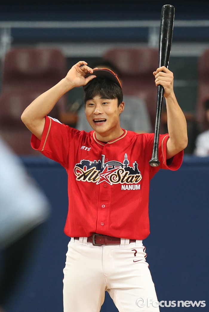 (서울=포커스뉴스) 16일 서울 고척 스카이돔에서 열린 2016 프로야구 올스타 경기에 앞서 가진 번트왕 대회에서 나눔팀의 김하성이 볼이 펴적에 들어가자 활짝 웃으며 팬에게 인사하고 있다.