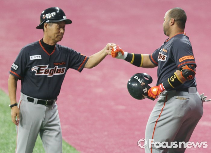 (서울=포커스뉴스) 16일 서울 고척 스카이돔에서 열린 2016 프로야구 올스타 경기에서 나눔팀 로사리오가 2회초 좌월 솔로 홈런을 치고 1루코치로 출장한 김성근 감독과 주먹을 마주치고 있다.
