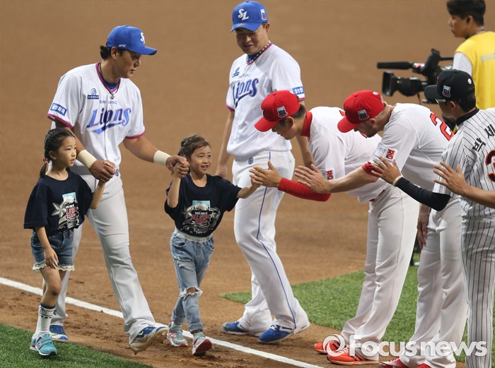 (서울=포커스뉴스) 16일 서울 고척 스카이돔에서 열린 2016 프로야구 올스타 경기 선수 소개에서 드림팀의 이승엽이 어린이와 함꼐 입장하고 있다.