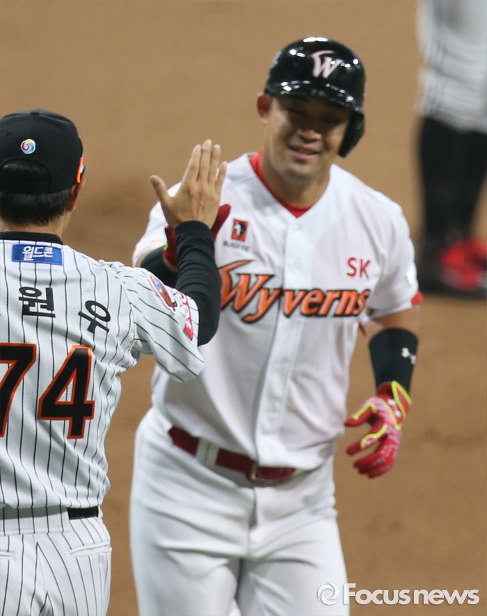 (서울=포커스뉴스) 16일 서울 고척 스카이돔에서 열린 2016 프로야구 올스타 경기 7회말 1사후 드림팀 정의윤이 두 타자 연속 좌월 솔로 홈런을 치고 3루를 돌고 있다.