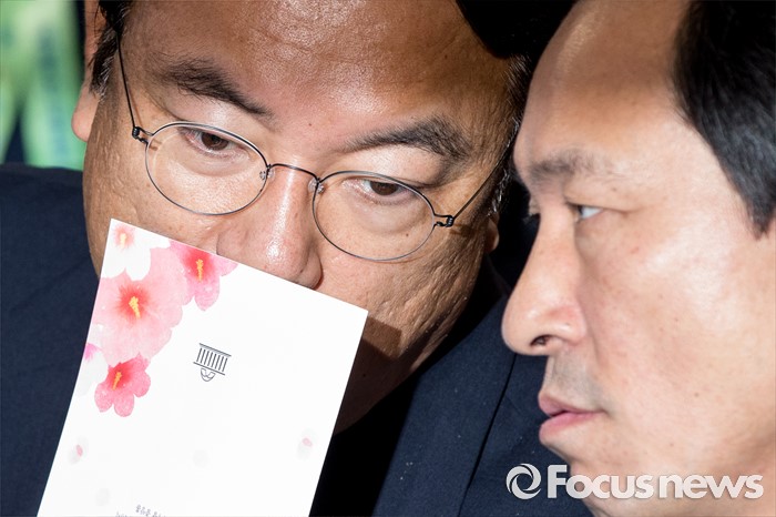 (서울=포커스뉴스) 17일 오전 서울 영등포구 여의도 국회의사당 중앙홀에서 열린 제68주년 제헌절 경축식에 참석한 정진석(왼쪽) 새누리당 원내대표와 우상호 더불어민주당 원내대표가 귀엣말로 대화하고 있다.