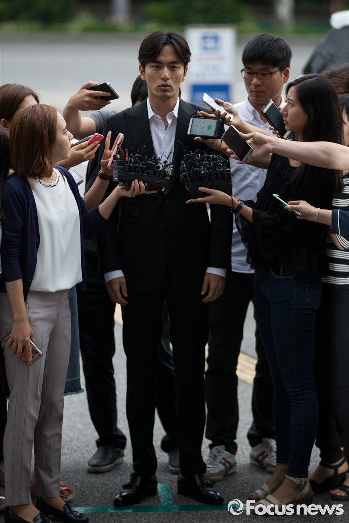 (서울=포커스뉴스) 성폭행 혐의로 피소된 배우 이진욱이 17일 오후 서울 강남구 수서경찰서에서 출석 전 취재진의 질문을 받고 있다.