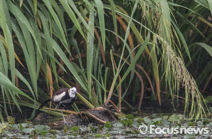 (의왕=포커스뉴스) 경기 왕송지에 나타난 물꿩이 장마비가 잠시 거세지자, 갈대숲에서 비를 잠시 피하고 있다.
