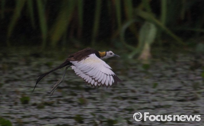 (의왕=포커스뉴스) 경기 의왕시 왕송지에 나타난 물꿩이 같은 장소에서 새끼를 기르고 있는 물꿩이 공격하자, 가볍게 날아 피하고 있다.