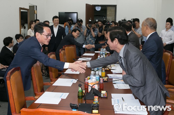 (서울=포커스뉴스) 18일 오전 서울 여의도 국회에서 열린 외교통일위원장 및 3당 간사단과 통일부, 개성공단 기업협의회 임원진 긴급간담회에 참석한 김도읍(왼쪽) 새누리당 원내수석부대표와 정기섭 개성공단입주기업 비대위 대표공동위원장 등 참석자들이 인사하고 있다.