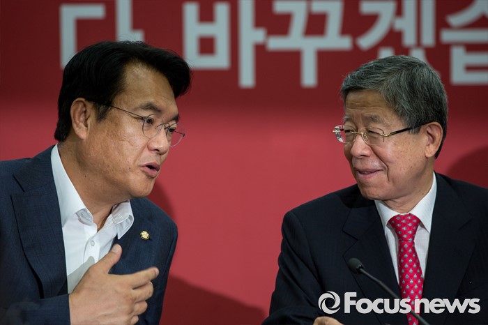 (서울=포커스뉴스) 김희옥(오른쪽) 새누리당 혁신비상대책위원장과 정진석 원내대표가 18일 오전 서울 여의도 새누리당사에서 열린 혁신비상대책위원회의에 참석해 대화 하고 있다.