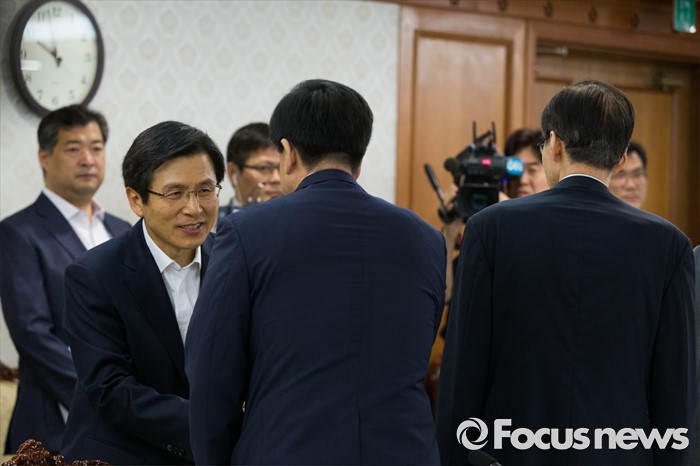 (서울=포커스뉴스) 황교안 국무총리가 18일 오전 서울 종로구 정부서울청사에서 열린 6.25 전쟁 납북피해진상규명위원회에서 민간위원들과 인사를 하고 있다.