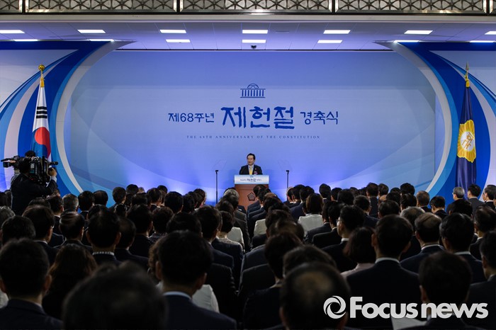 정 국회의장과 여야 3당 원내대표는 지난 6월30일 가 국회의원 특권 내려놓기와 관련된 국회의장 직속의 자문 기구 설치에 합의했다.(서울=포커스뉴스) 정세균 국회의장이 17일 오전 서울 영등포구 여의도 국회의사당 중앙홀에서 열린 제68주년 제헌절 경축식에 참석해 경축사를 하고 있다. 2016.07.17 이승배 기자